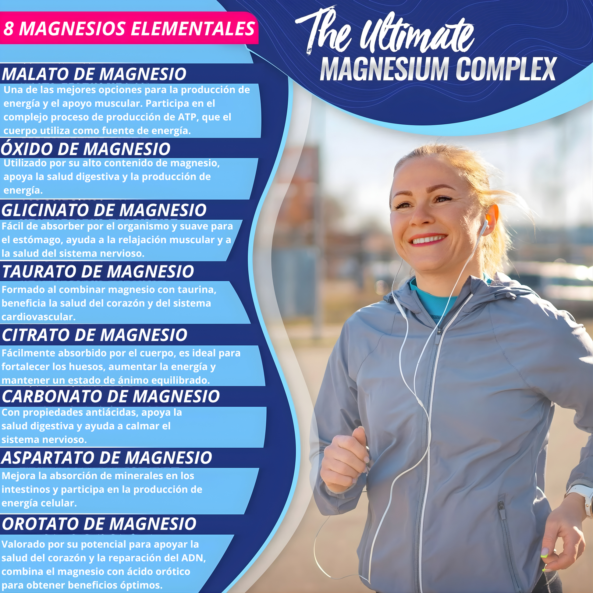 Su mezcla equilibrada incluye óxido, glicinato, malato, taurato, citrato, carbonato, aspartato y orotato de magnesio, ayudando a: